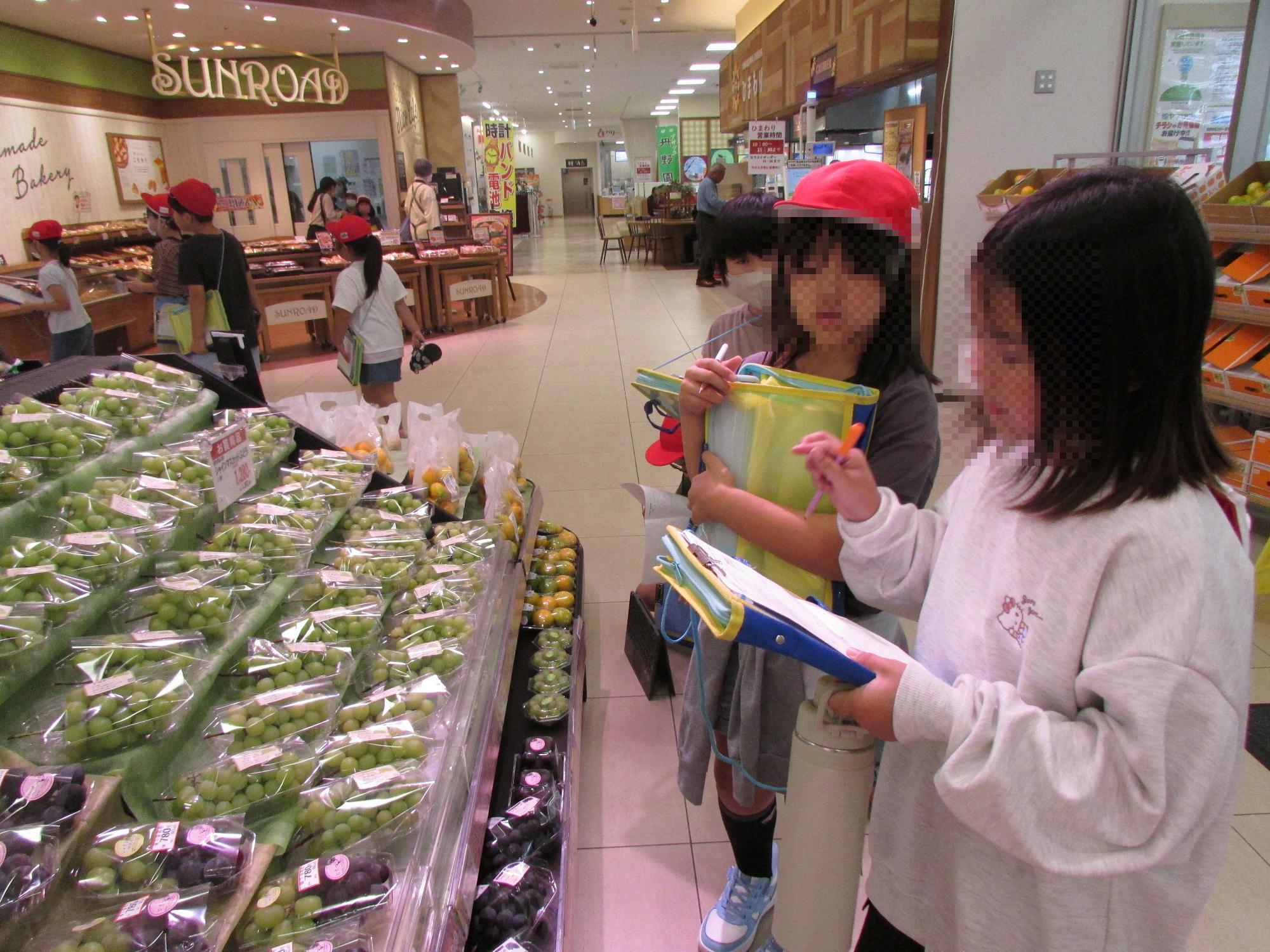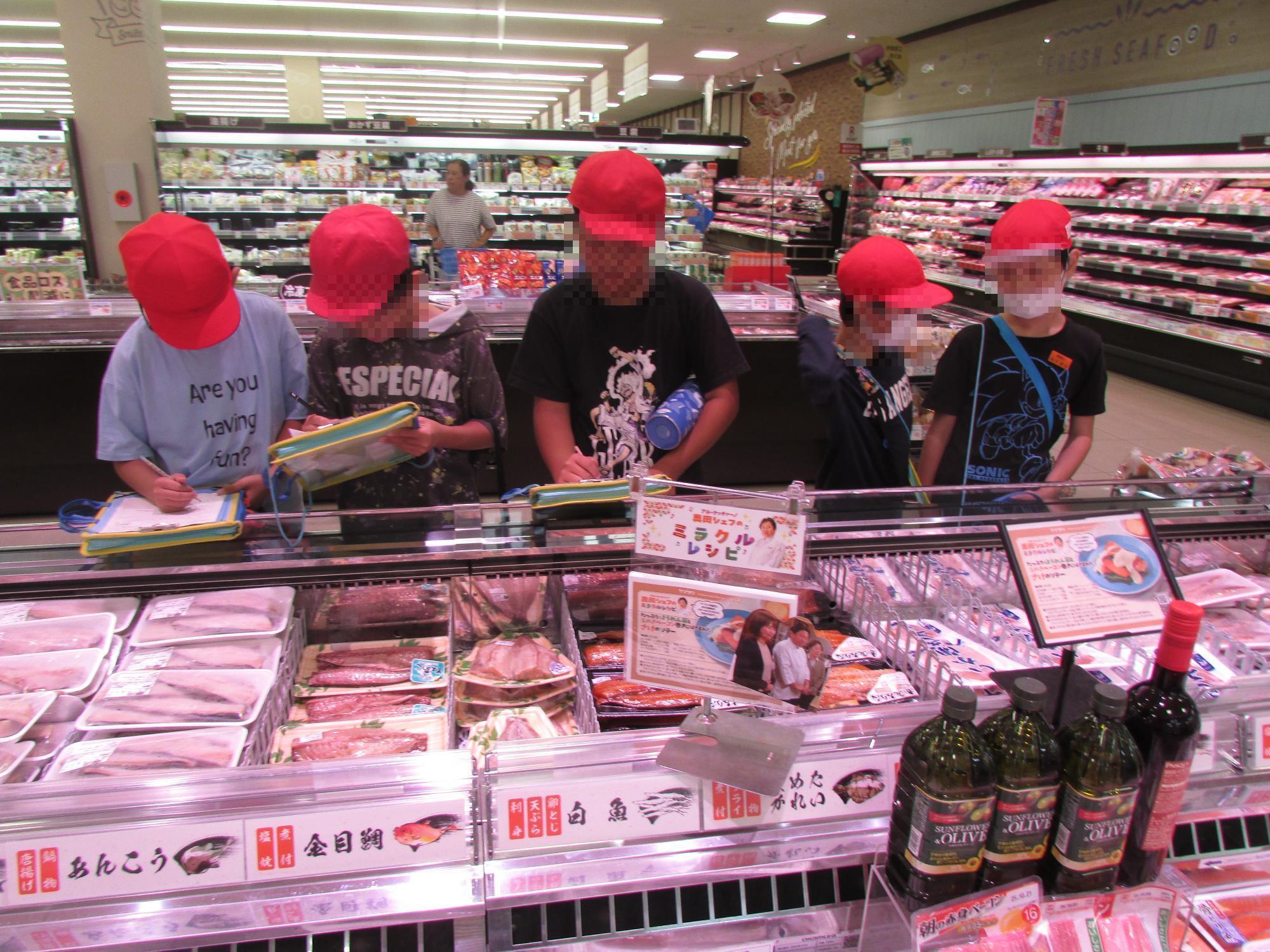 身近なスーパーで、お客さんに喜んで買ってもらうために、どんな工夫をしているか調べました。事前に見たい場所と質問したいことを決めて、学習させていただきました。