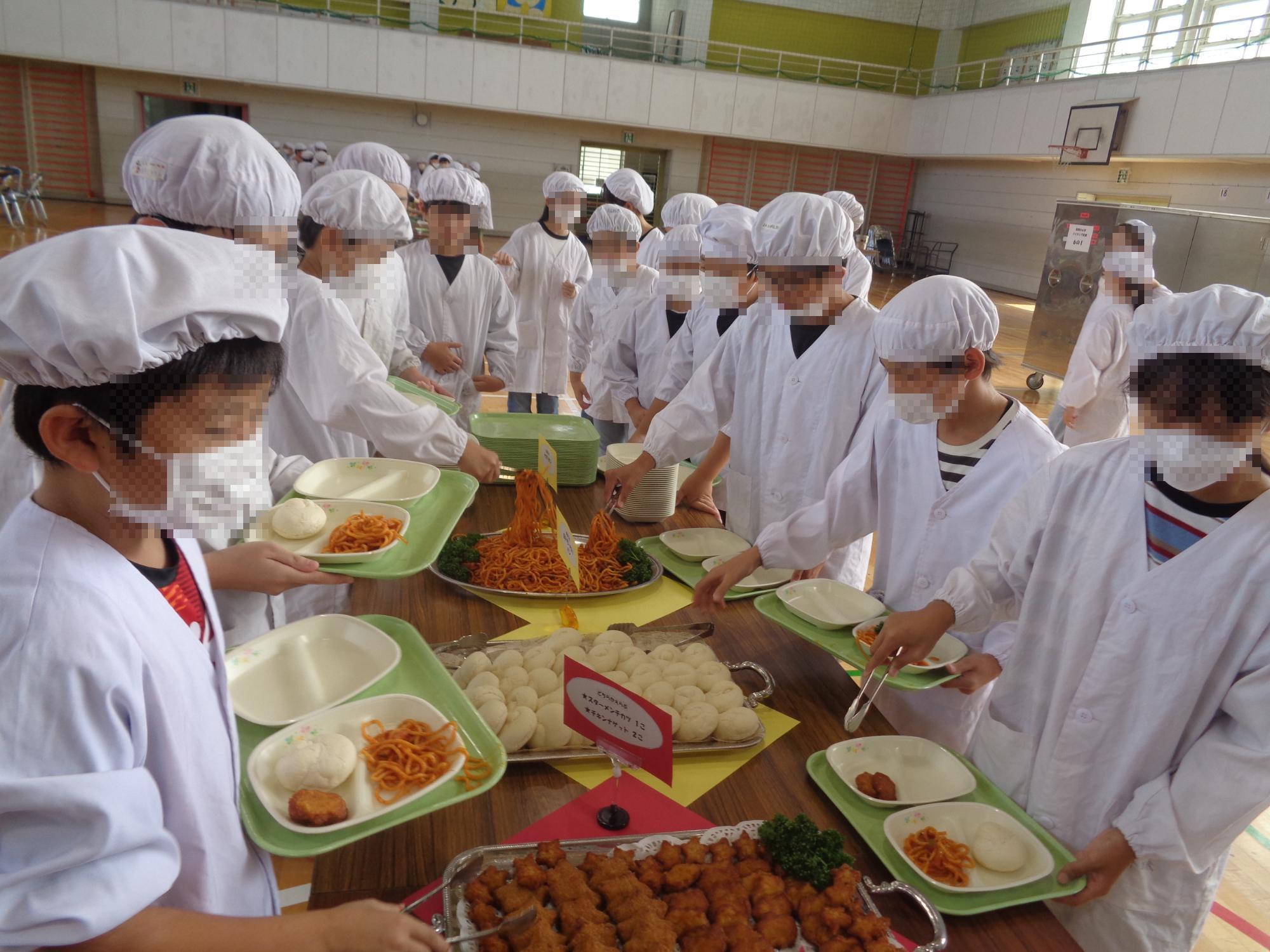家庭科で学習した栄養バランスを頭に入れながら自分で盛りつけて、思い思いの給食にすることができました。