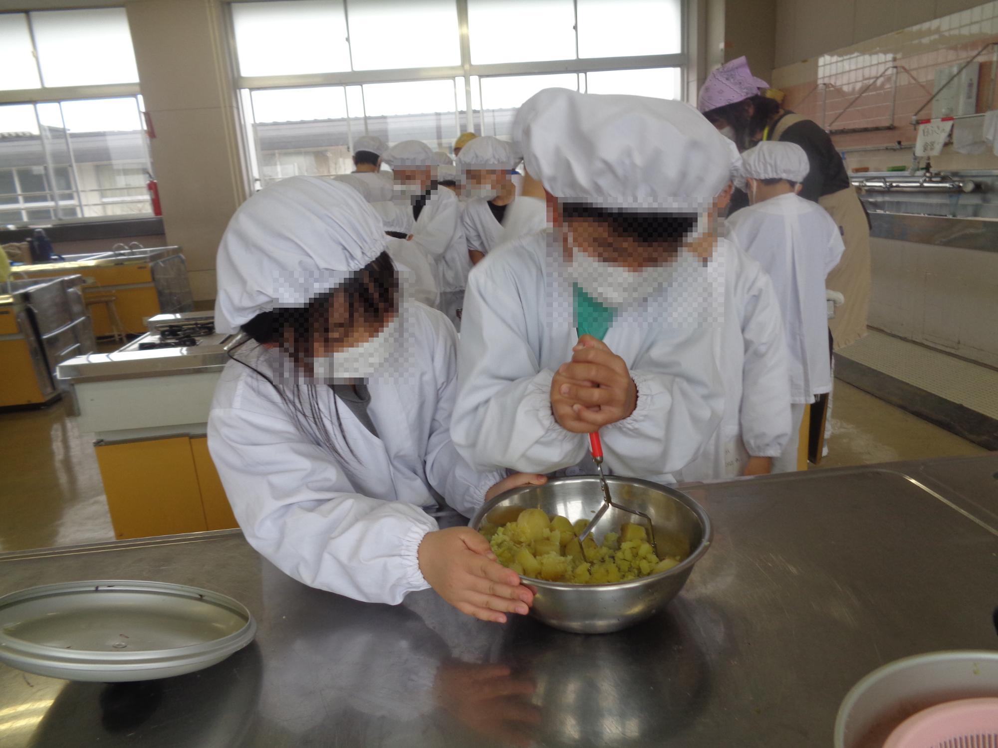 以前みんなで収穫したさつまいもをゆでてつぶす作業では、地域サポーターの皆様にお手伝いいただきながら進めました。子どもたちは、慣れない手つきながらも協力してさつまいもをマッシュ!