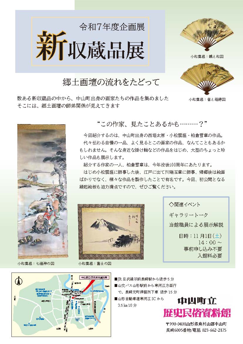 主な展示として、江戸の高名な日本画家・谷文晁の高弟である柳沢出身の西塔太原から始まる郷土画家たちの師弟関係の流れにそって、小塩出身の画家・小松雲涯の掛け軸などの作品、さらにその弟子柏倉雪章の縁起絵板を展示します。