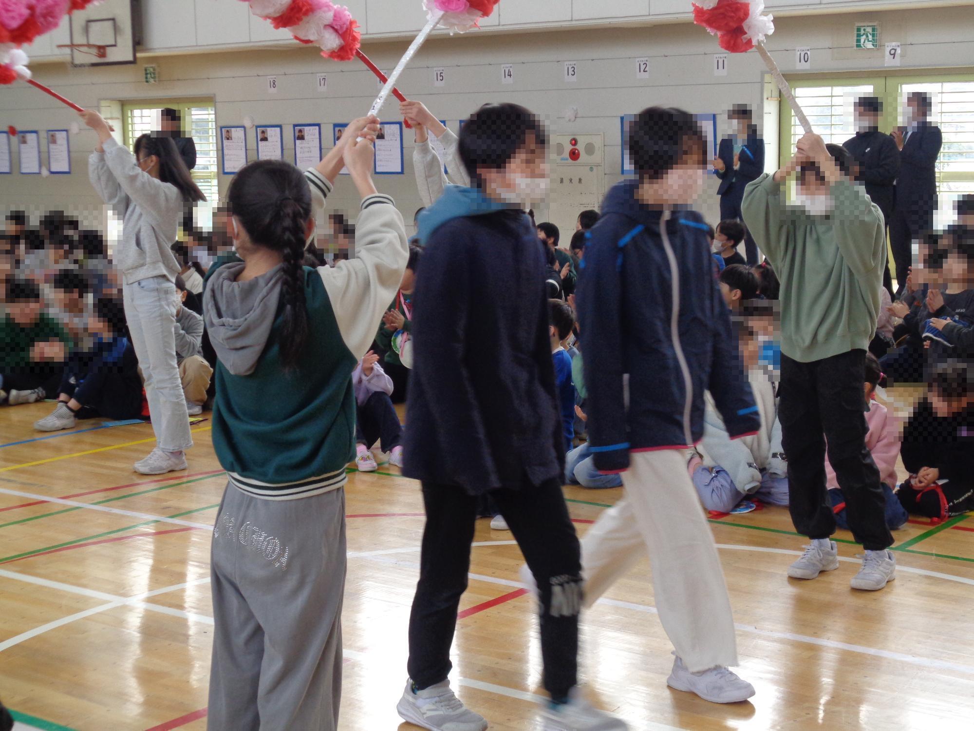本日、全校児童が集まり「6年生を送る会」が開かれました。1年生から5年生までの各学年が、これまで学校のリーダーとして活躍してきた6年生へ、感謝の気持ちを伝えました。各学年からは「中学校でも頑張ってください」という励ましの言葉とともに、工夫を重ねた内容の発表でした。6年生はそれに応えるように、お返しの歌を贈ってくれました。最高学年らしい落ち着いた歌声が会場に響き、在校生はその姿を真剣な表情で見守っていました。全校生で温かな時間を共有し、来週の卒業式に向けて、気持ちが高まる会となりました。